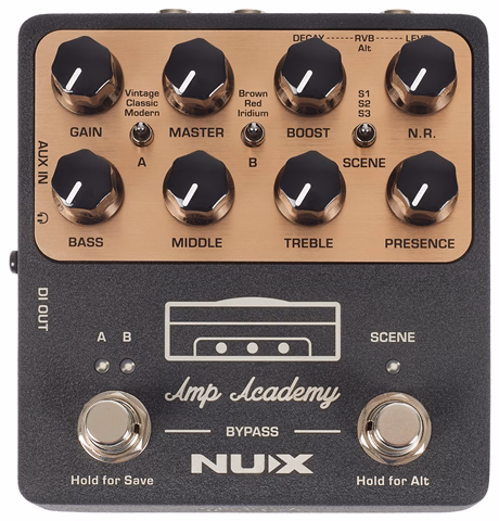 Regler: 2x FS, Gain, Master, Boost, N.R., Bass, Middle, Treble, Presence, 3x 3-way switch,